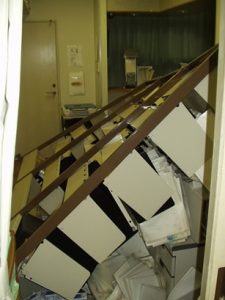 当日は金曜で休診日でした。翌日出勤すると、受付のカルテ棚は写真のように倒れて足の踏み場の無い状態で、医療機械も一部は壊れており、とても業務をできる状況ではなく、午前はやむなく臨時休診としスタッフ総出で片づけをし、ようやく午後から診察を始めました。